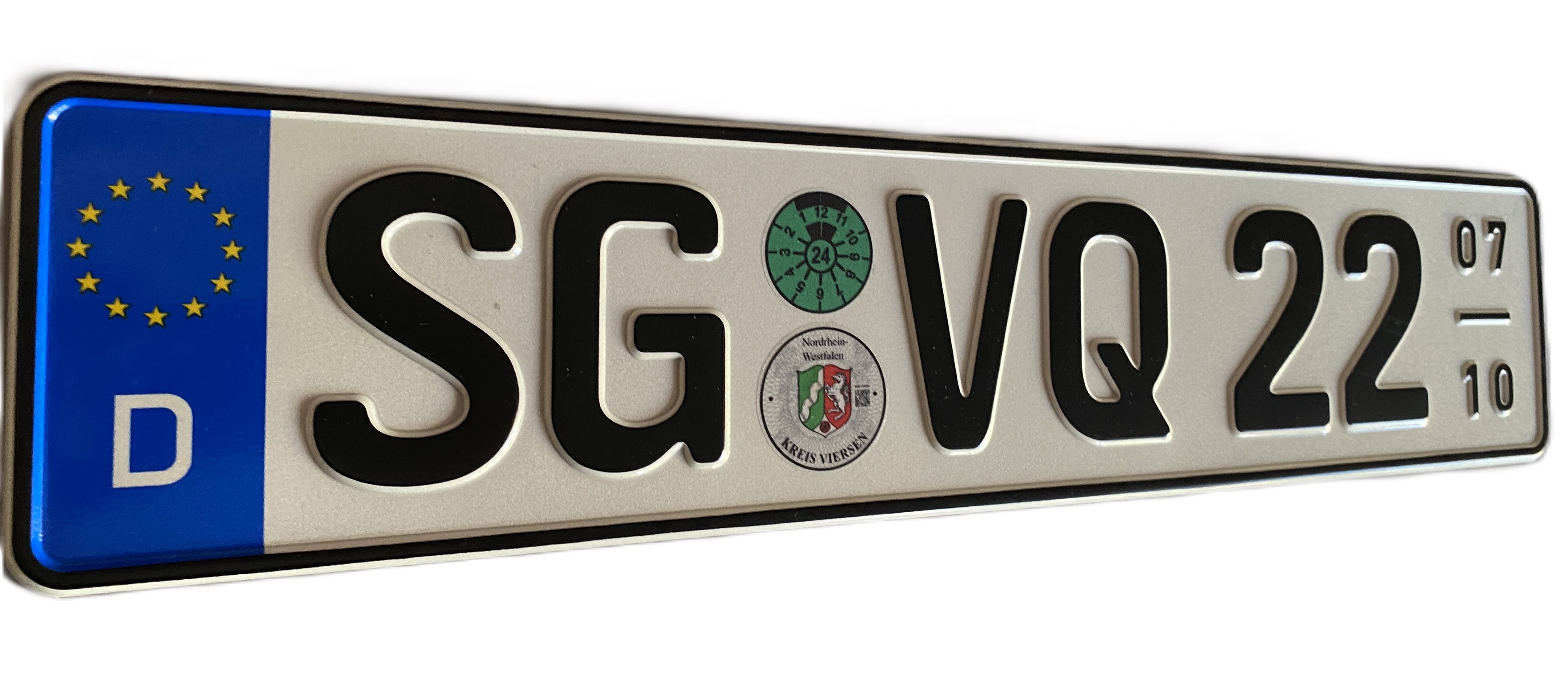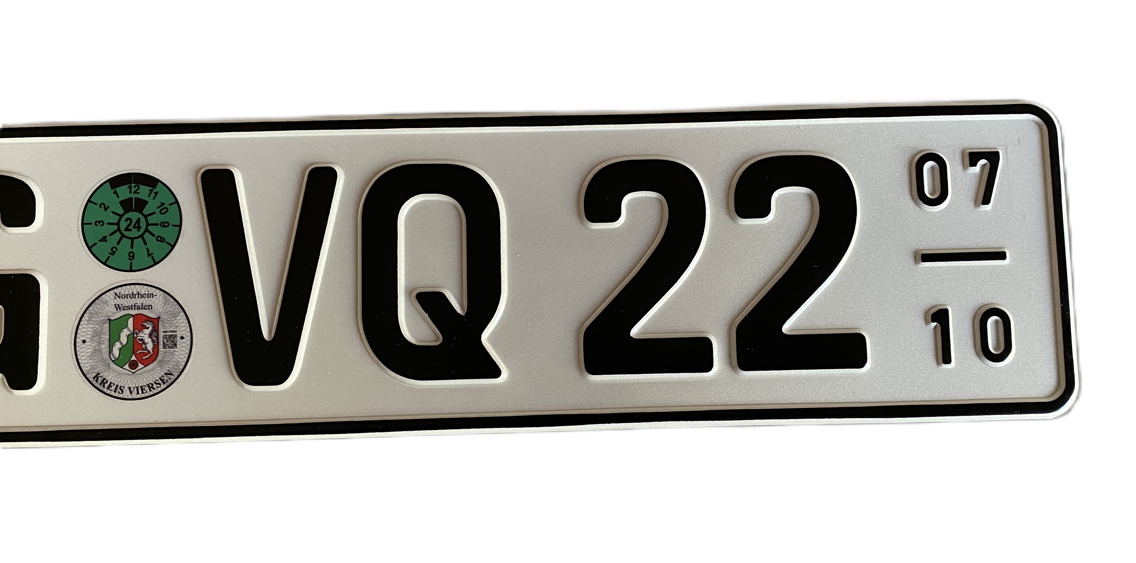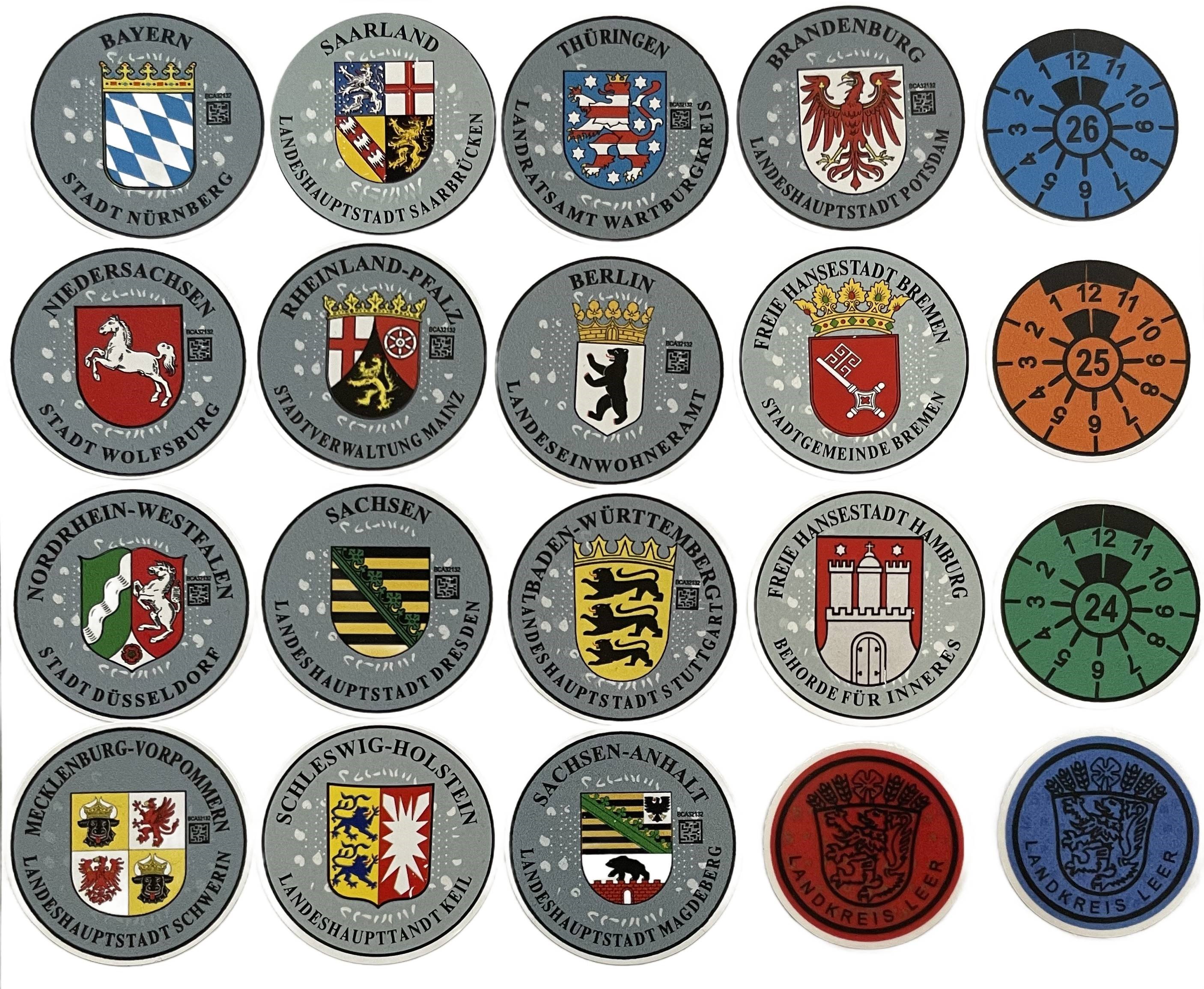 Oferta dotyczy dwóch tablic Niemieckiej oraz kompletu naklejek (dwóch przedstawiającej odpowiedni Bundesland stosowny do podanych wyróżników tablicy oraz jednej naklejki certyfikatu Technischer Überwachungsverein (TÜV).